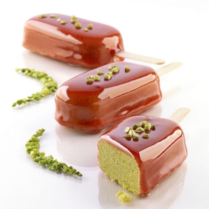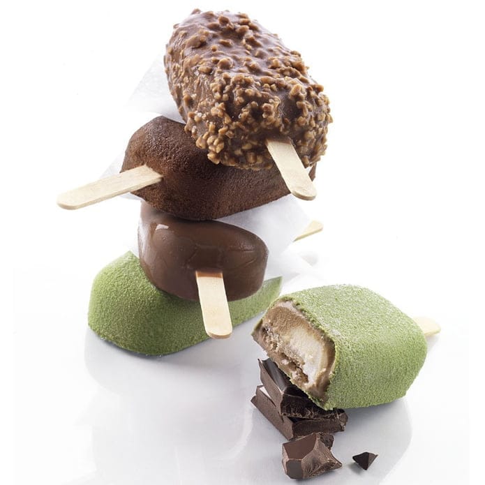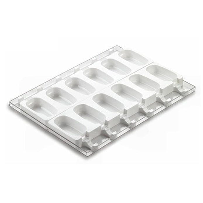 Glasform für Eis am Stiel, hergestellt aus lebensmittelechtem Silikon, das sowohl Gefrieren als auch Backen standhält. Von – 60°C bis +230°C. Mikrowellen- und spülmaschinenfest.